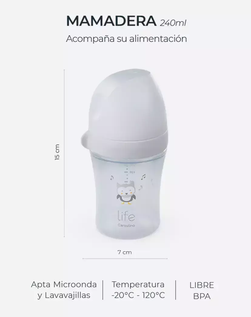 Nuestra mamadera está especialmente diseñada para apoyar el crecimiento y desarrollo de tu bebé. La tetina ofrece una transición suave entre la lactancia materna y el biberón, promoviendo una experiencia de alimentación natural.