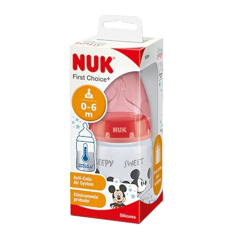 Esta función es una verdadera innovación. Para que los padres no le den el alimento demasiado caliente al bebé, las mamaderas NUK First Choice+ ahora tienen un indicador de Control de Temperatura NUK. Luce como un termómetro y está ubicado dentro de las marcas de graduación. El color del termómetro cambia con la temperatura del contenido de la mamadera. Esta función ayuda a los padres a lograr la temperatura óptima cuando alimentan a su bebé.