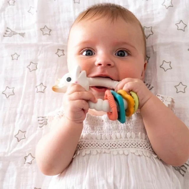 Con numerosas partes suaves para masticar y con varias texturas (manchas de Sophie, crestas, orejas y cuernos) alivia eficazmente las encías doloridas del bebé.