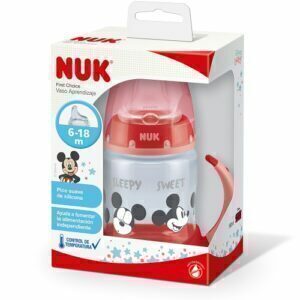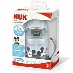 Cuando el bebé comienza la alimentación complementaria el Vaso Aprendizaje NUK First Choice asegura una suave transición del pecho o de la mamadera al vaso. Su pico NUK First Choice+, de suave silicona, es antiderrame. Cuenta con el sistema anticólicos NUK Air System, que iguala la presión en el vaso y reduce el riesgo de tragar aire, ayudando a reducir los cólicos del lactante.